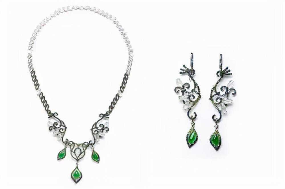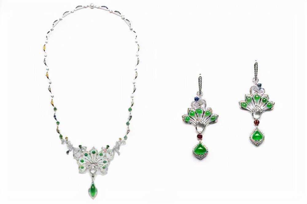 七彩云南孔雀系列翡翠项链、耳环完美的诠释出了孔雀的灵动之美,妖艳欲滴的翡翠配合18K金、沙弗莱石、蓝宝石和青金石等多种材质后,整体散发出无尽的趣味和灵动之美。