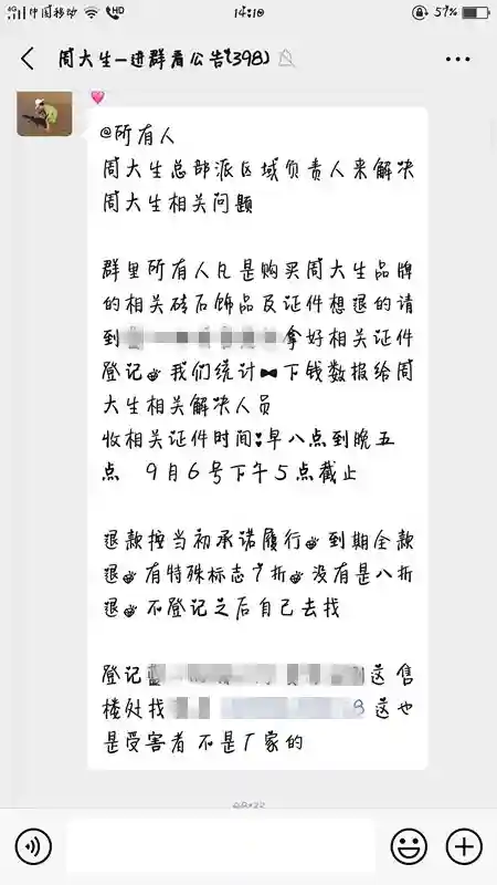 仲先生表示,目前他已经联系到了维权群的群主,"我们正在统计相关数据,因为这个按买价回收的是加盟商自己的承诺,我们现在还不清楚他们到底是怎么承诺的,而且到底承诺了多少加盟商,也没有具体的数字。"仲先生说,他已经让维权群的群主收集顾客购买的资料了。"资料收集上来之后,我们就会进行处理。"仲先生表示,如果加盟店的老板无法兑现承诺,他们周大生品牌会出面促使这家店兑现加盟店答应顾客的承诺。"对于按买价回收的承诺,经核对后确认是周大生的珠宝的产品,确认当时确实有这样的承诺,我们就会促使加盟店兑现承诺,承诺按卖价回购,至于加盟店,必要时我们会追究其相应的责任。"
