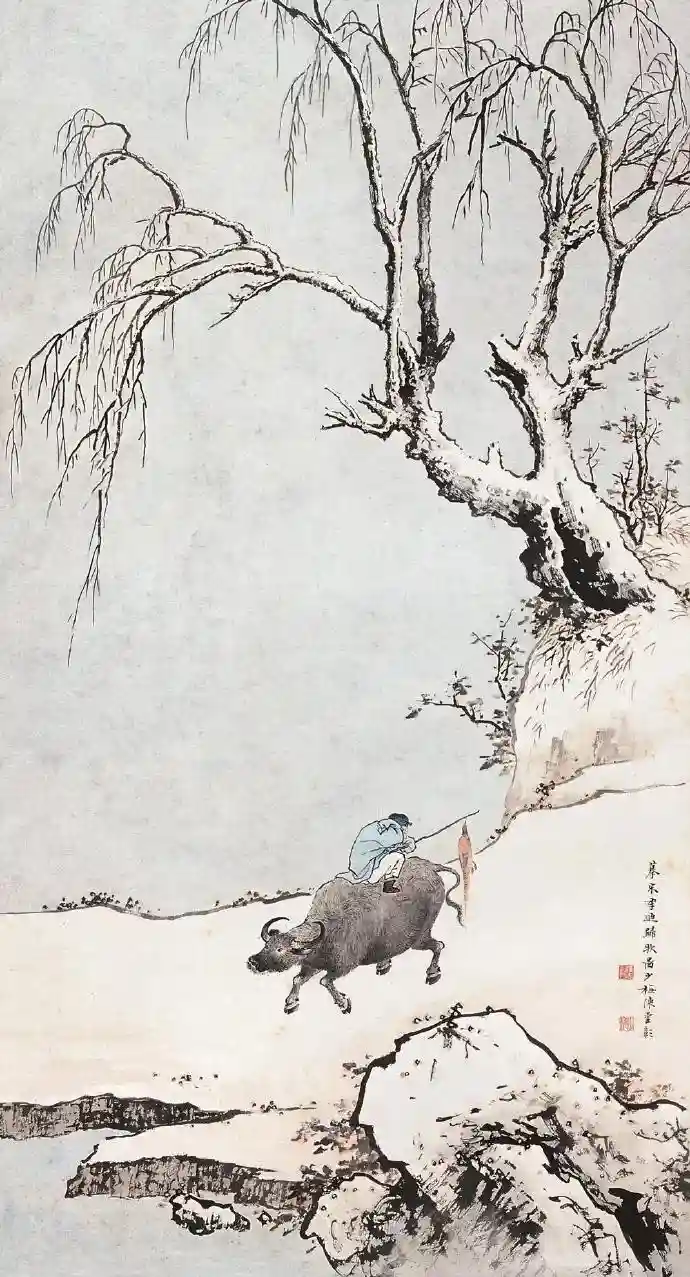 李迪,南宋孝宗、光宗、宁宗三朝画院待诏。李迪画风为工细与粗放相结合,所绘动物,精确生动,富于质感。少梅此作,画法一仍李迪,以水墨渲染出雪景之清寒,而雉鸡设色的斑斓、坡岸和离离枯草的赭色,与瑟缩牧童上衣的冷青色,适成对比,以全新的笔墨诠释宋人画意。