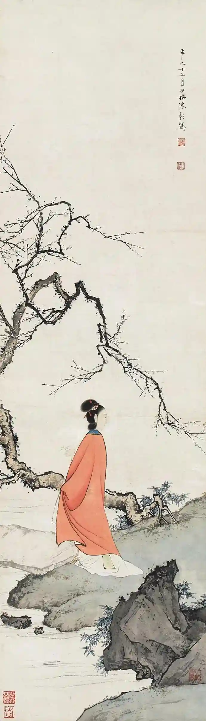 忽见寒梅树,花开汉水滨。不知春色早,疑是弄珠人。此幅《赏梅图》高雅超凡幽香暗生,梅花暗香疏影,枝干遒劲,白梅点点,凌寒独放,雅洁之气跃然纸上。仕女身披大红斗篷,拈花回眸,以纤细的线条钩画仕女面部并以淡赭渲染阴暗,显得立体而清俊。衣纹线条则挺拔流畅,表现了衣物的质感。