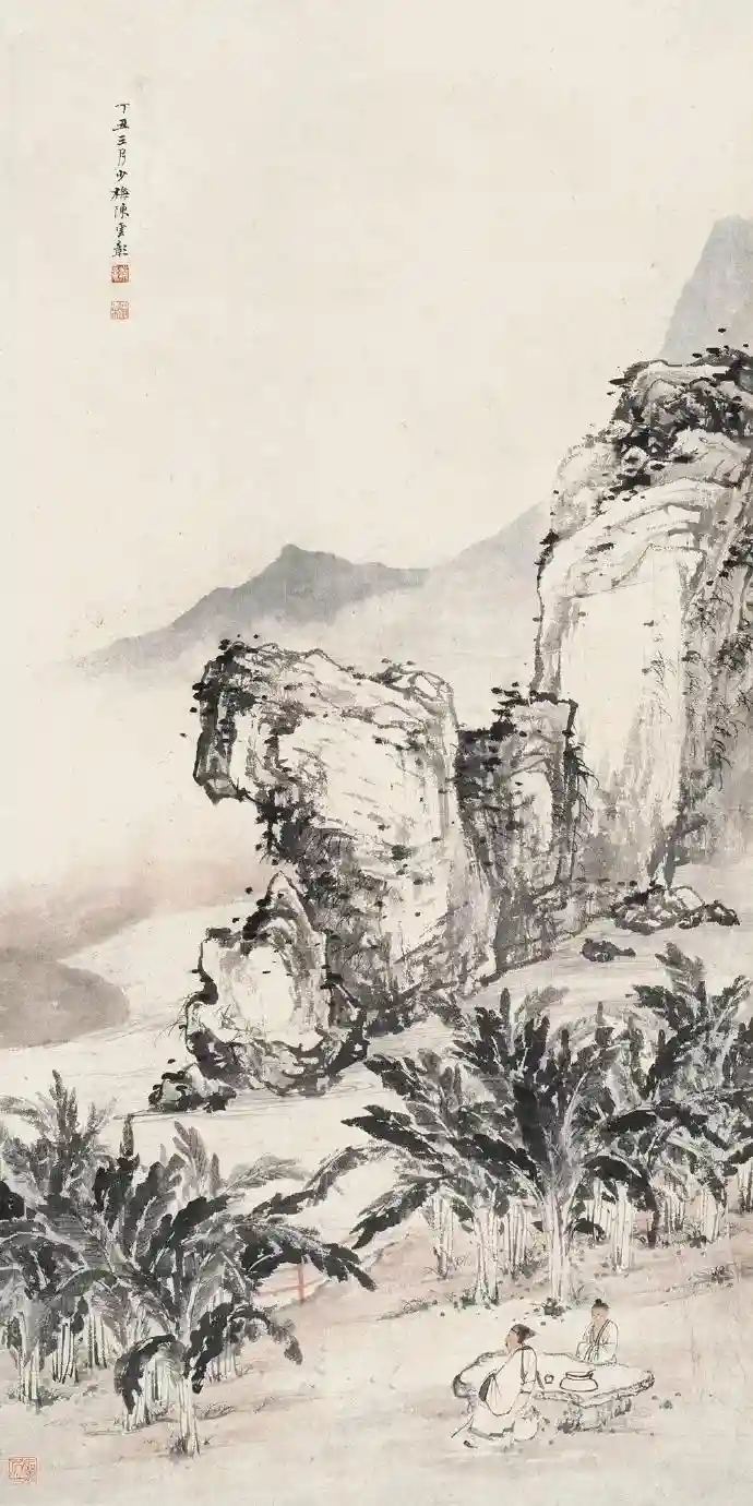 绵延的群山之中,雾气弥漫在树梢,溪水自山之深处缓缓地流出,枝叶婆娑的树下,两位士人临溪而坐,谈论古今,这是一幅令中国历代知识分子所向往的桃花源图景,是一个隐居避世的天堂。因为现实中是无处可避的,所以画家才创造这样一个心中的圣地去承载理想,而陈少梅的笔法也将这种理想的风景表现得淋漓尽致。画中远景的山石运用斧劈皴和点苔表现出坚硬和湿润的质感,画面左下部用缭绕的云气和蜿蜒的溪流表现出山中的虚静之致,右下部的两棵大树写得很精彩,树干细长虬曲,树枝缤纷摇曳,淡蓝色点出的树叶打破了树枝写法的细谨,也使树的气质与整幅画的清雅格调相契合。两位士人宽袍大氅,气定神闲,颇有林下之风,仿佛已与山林“天人合一”。整幅笔法劲健清爽,境界空灵渺远,既得北派山水画的骨力,又得南派山水画的风韵,是画家精研古法又出自机杼的佳作。