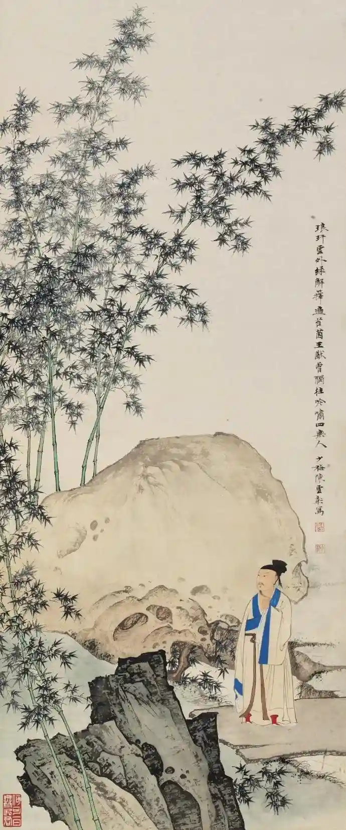 此幅画作右上题曰:“琅玕云外绿,解箨遍苔茵。王猷曾独往,吟啸四无人。少梅陈云彰写。”作为一位善于以历史故事及典故入画的画家,陈少梅本人沉静博学,其内在气质和精神品格会自然流露,用一种深沉、静心的创作态度参照自然,抒发己身思绪情怀,并通过画笔生动地传达给观者。