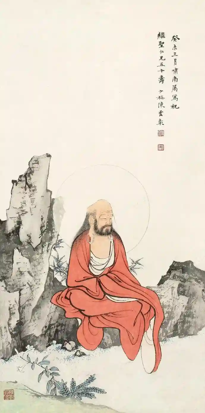 本幅为画家四十年代之作。无量寿佛寓祝寿之意,开脸见面目,凸额垂耳,气息古朴清奇,而勾勒细致,髪丝须髭,几毫毕现,通体披红袍,线条处理刚劲俐落,具浙派笔意,背景视以岩石,以其擅长的北宗小斧劈皴法出之,写来极见用心。“水松石山房”主人在其文章中提出画中佛袍衣褶垂直而下,令其坐姿似非于石块上而半悬于空中,这个视觉上的效果未知是否出自画家安排,以示画中非凡俗之人。不过,这个观画视点无疑给我们带来了新的欣赏趣味。