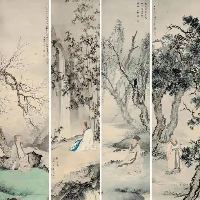 陈少梅《柳荫高士》四屏128.5cm×31.5cm×4