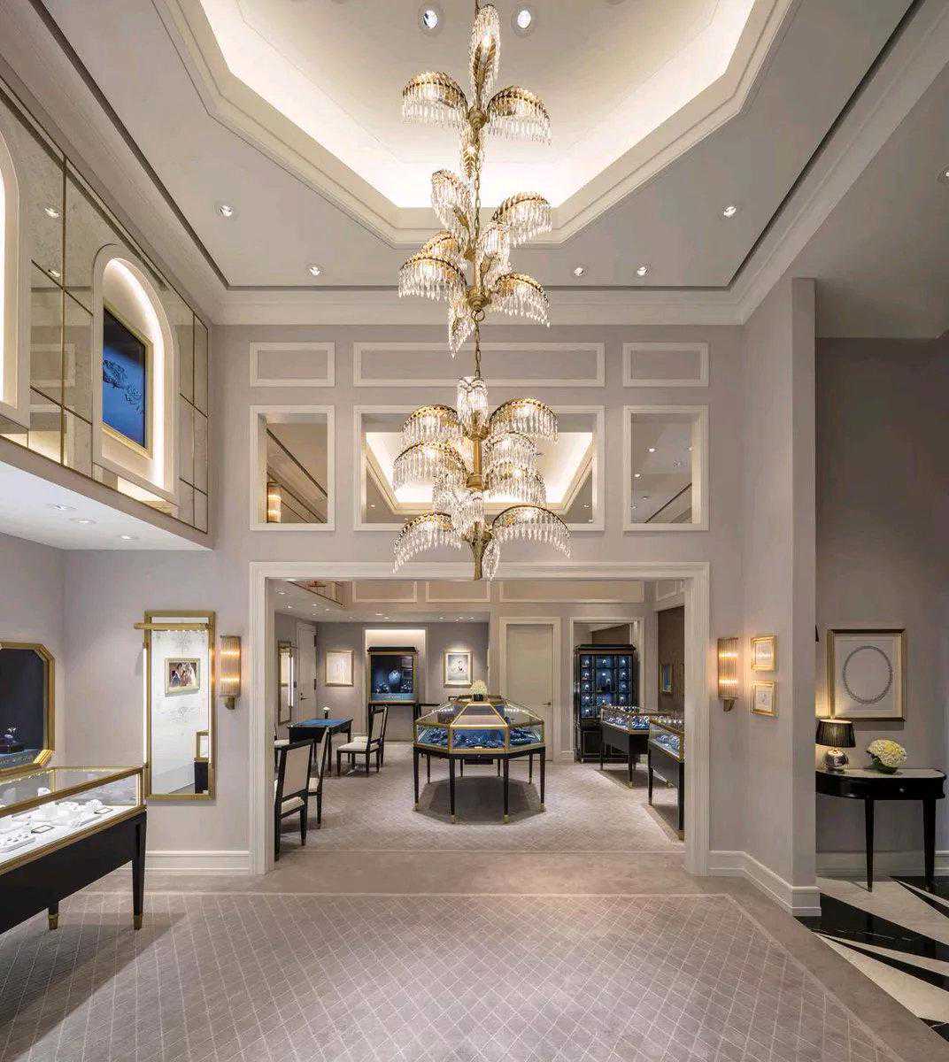 旗舰店硬装以珍珠、灰褐和古铜色调交相辉映,软装则以闪光蓝呈现出玻璃般的透明质感。微妙的光影借助镜面反射,将空间视觉效果无限放大,更衬托出珠宝的璀璨光芒。