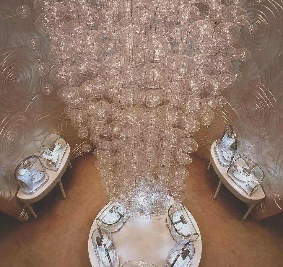跨入店门仿佛穿越至18世纪的魔法城堡。数串Murano玻璃球吊灯沐浴在明亮的光线中,仿佛向天空飞升的透明气泡。