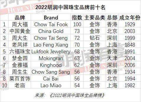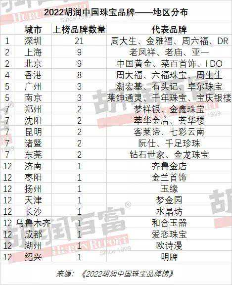 1月18日,胡润研究院发布《2022胡润中国珠宝品牌榜》,列出了前70名中国珠宝品牌和前18名中国珠宝B2B企业。这是胡润研究院第一次发布中国珠宝品牌榜。其中,深圳上榜珠宝品牌最多,共21个;同时,深圳也是上榜珠宝B2B企业最多的城市,共8个。