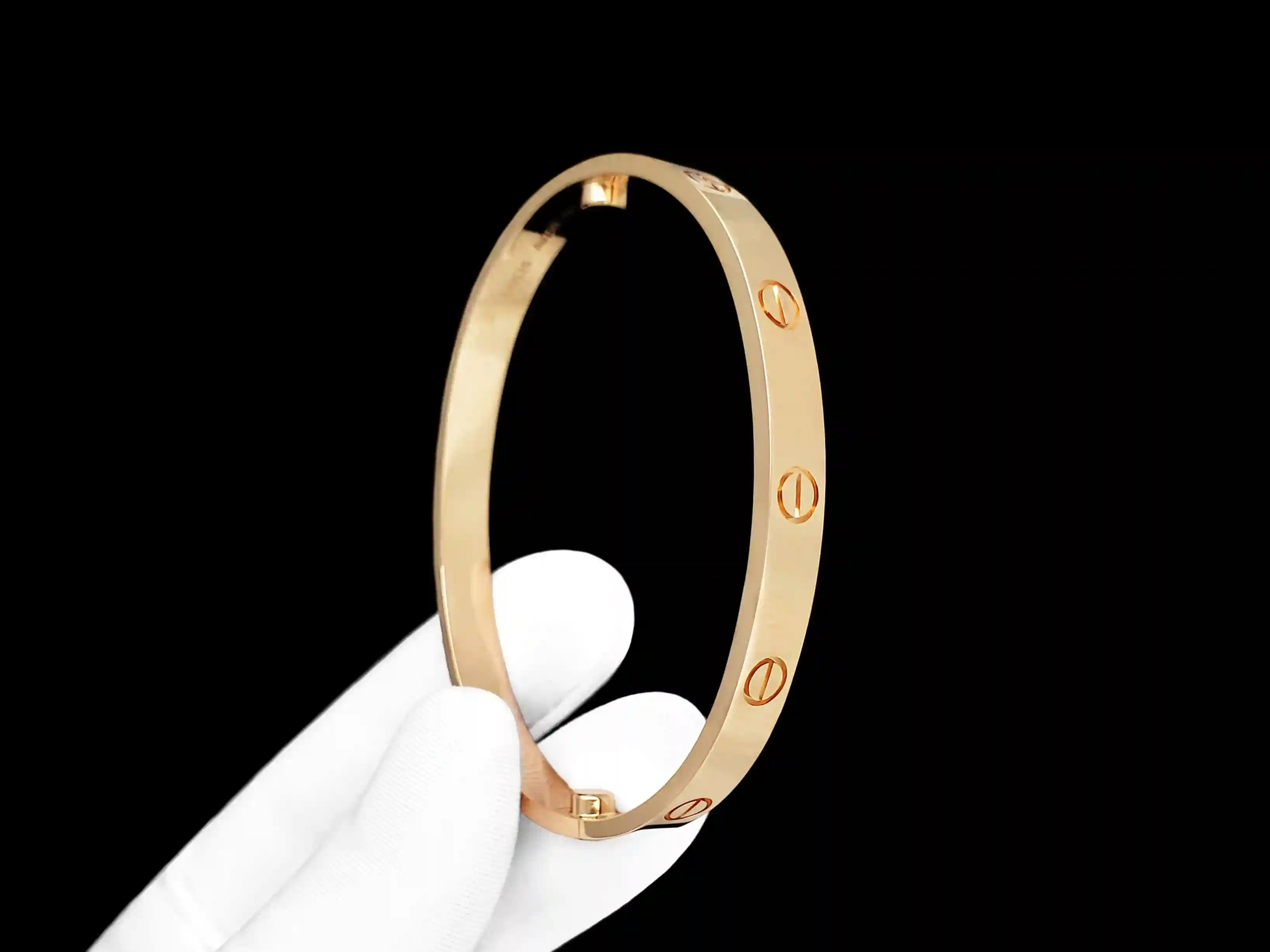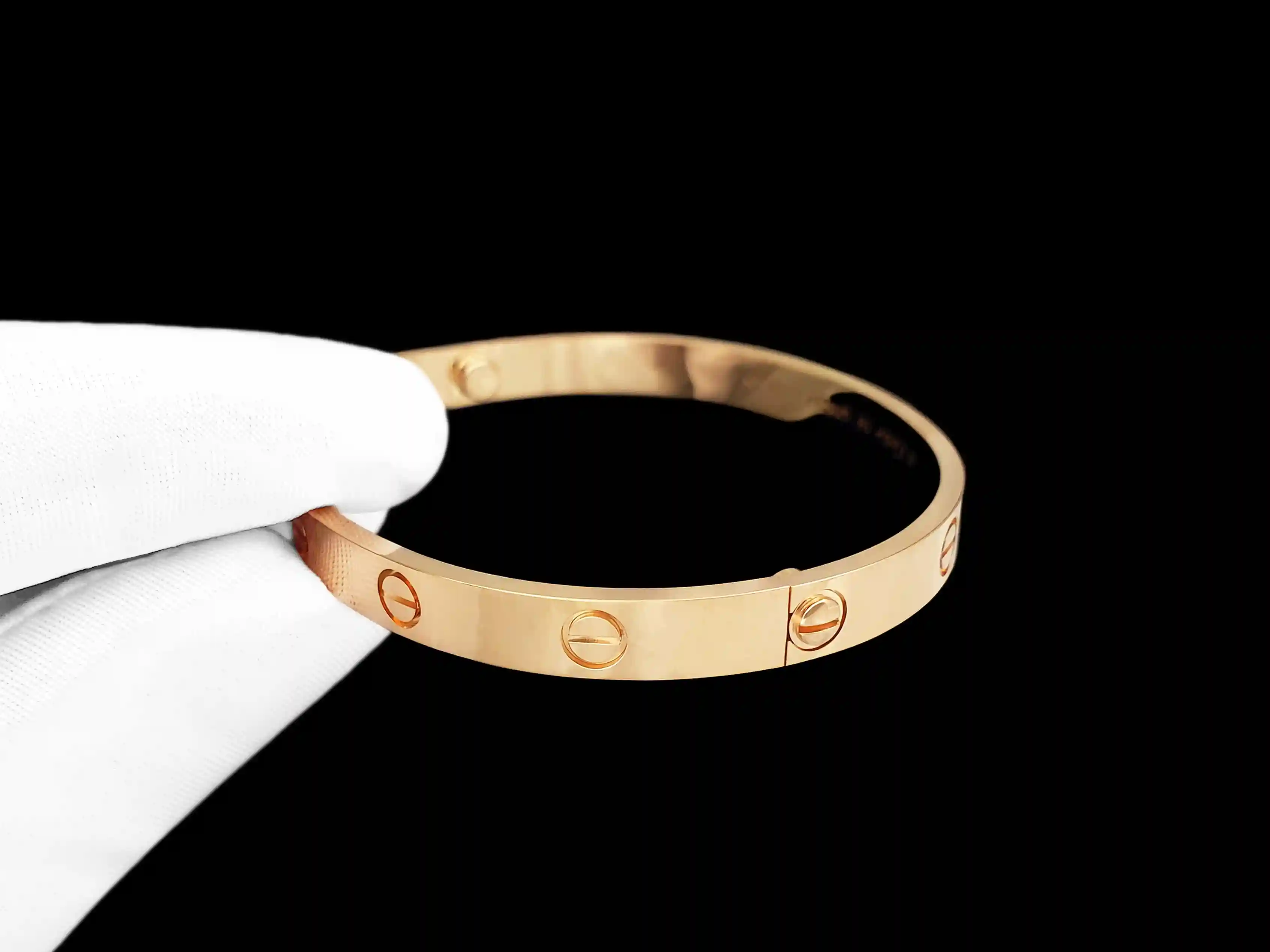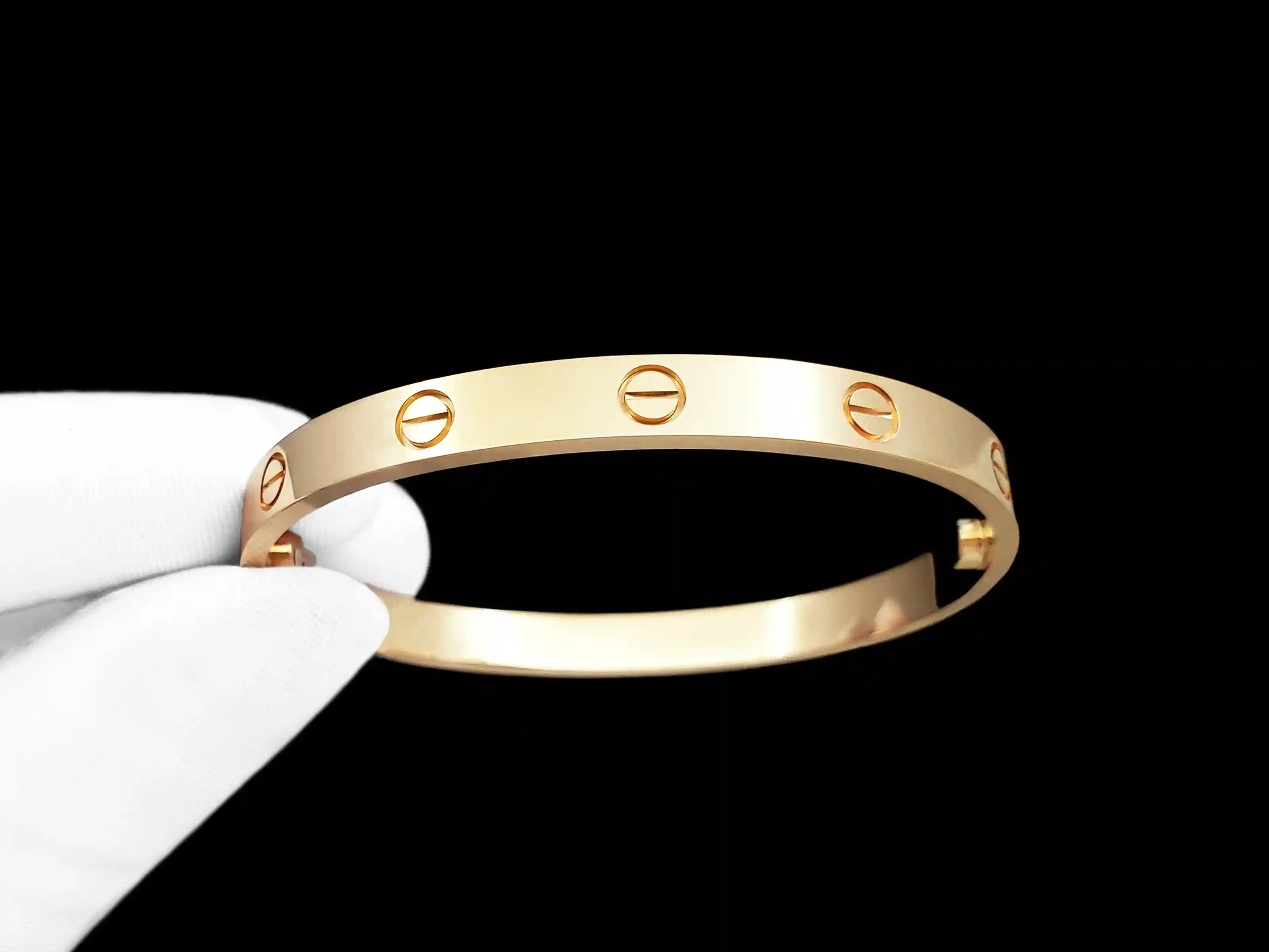 卡地亚最经典的Love手镯,因为表面环绕着一个个圆形纹饰,因此还被称为螺丝手镯。