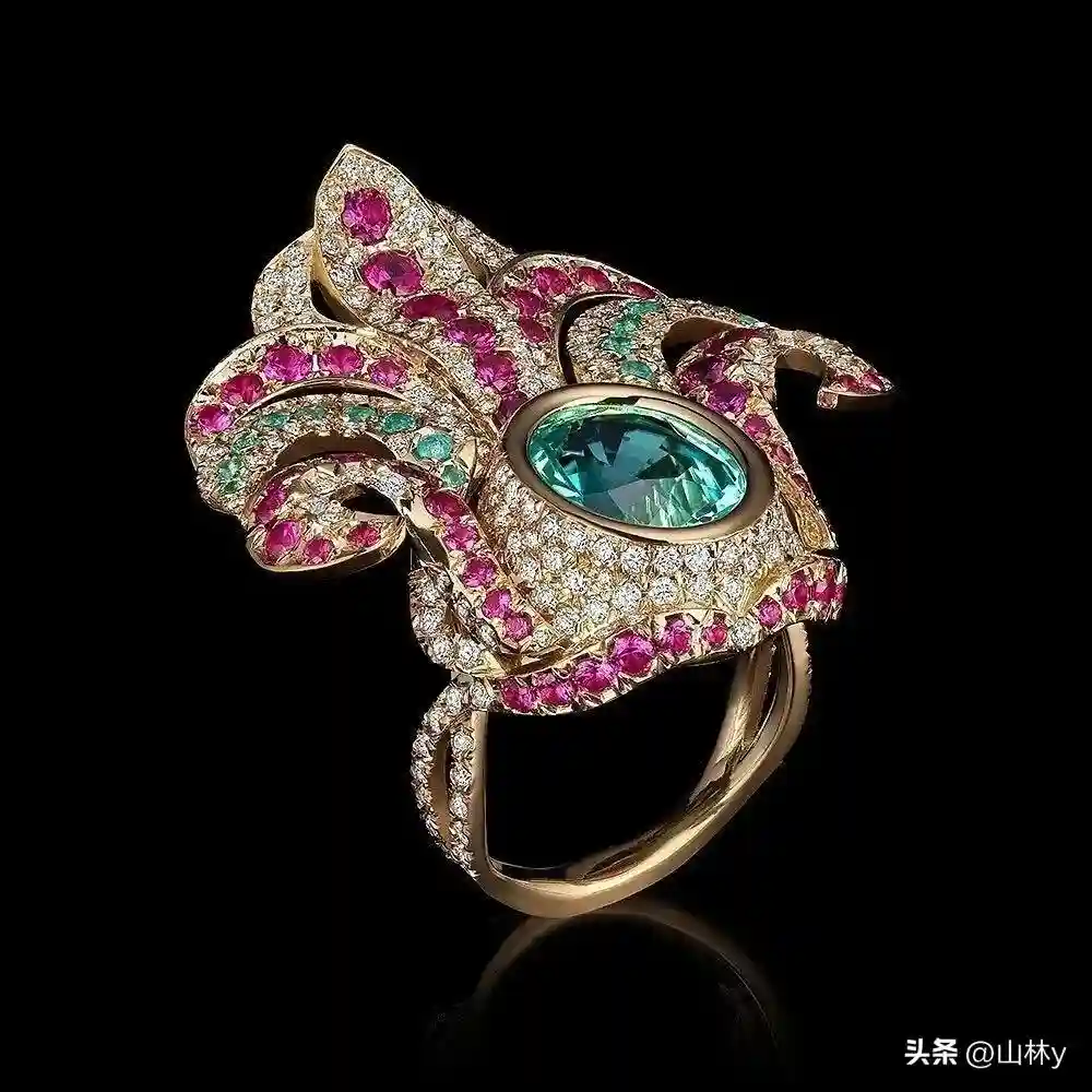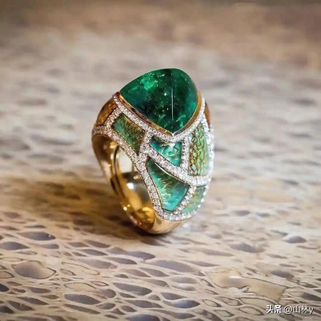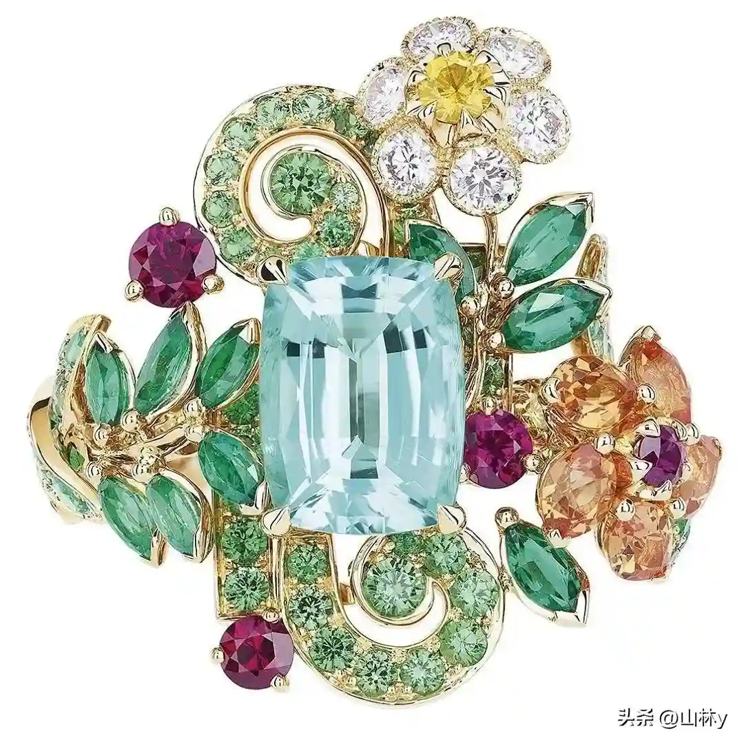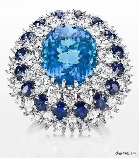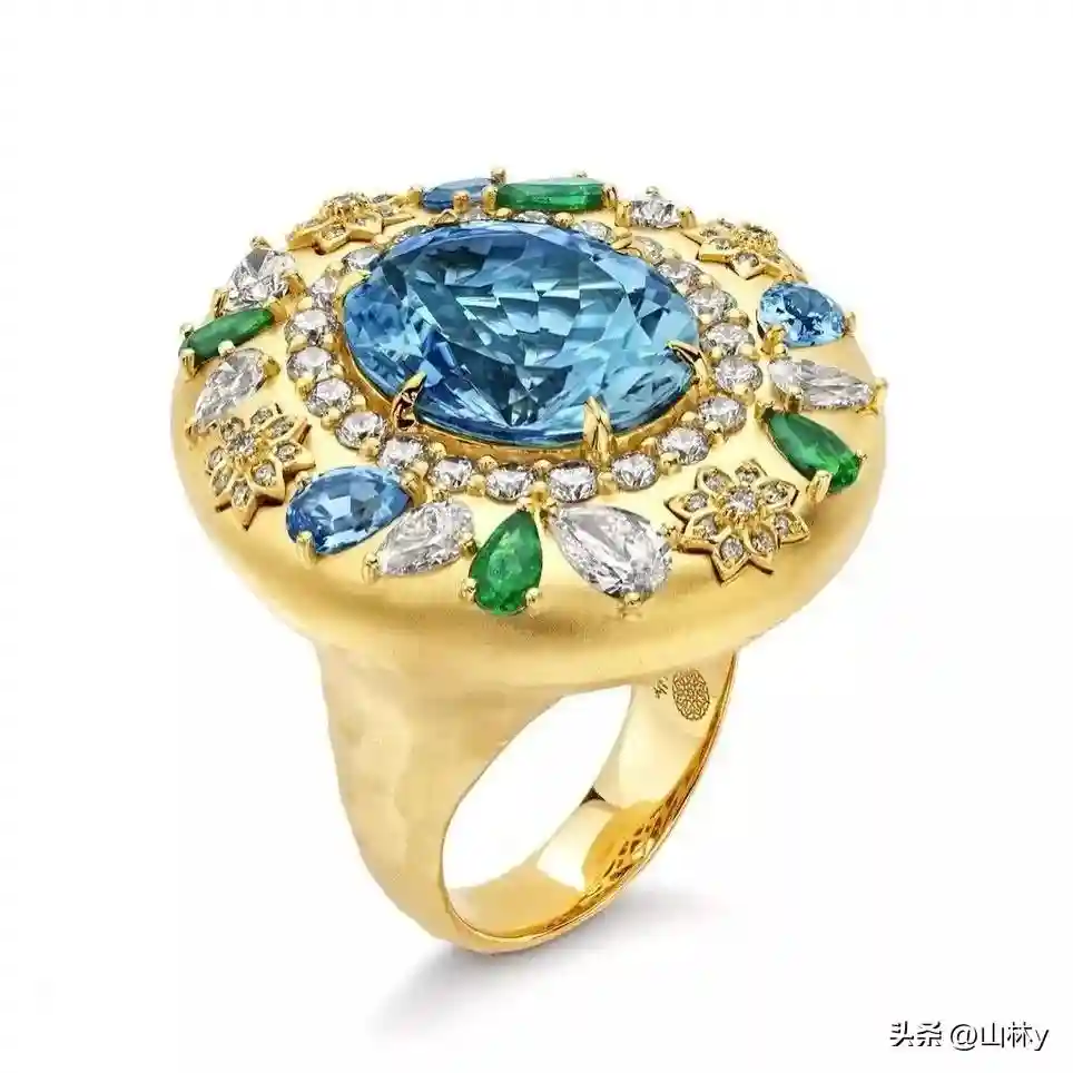 这枚硕大的戒指,戒面是由宛如海洋般的蓝色的蓝宝石镶嵌,旁边装饰有绿宝石、蓝宝石和白钻,整个戒指看起来珠光宝气,雍容华贵。