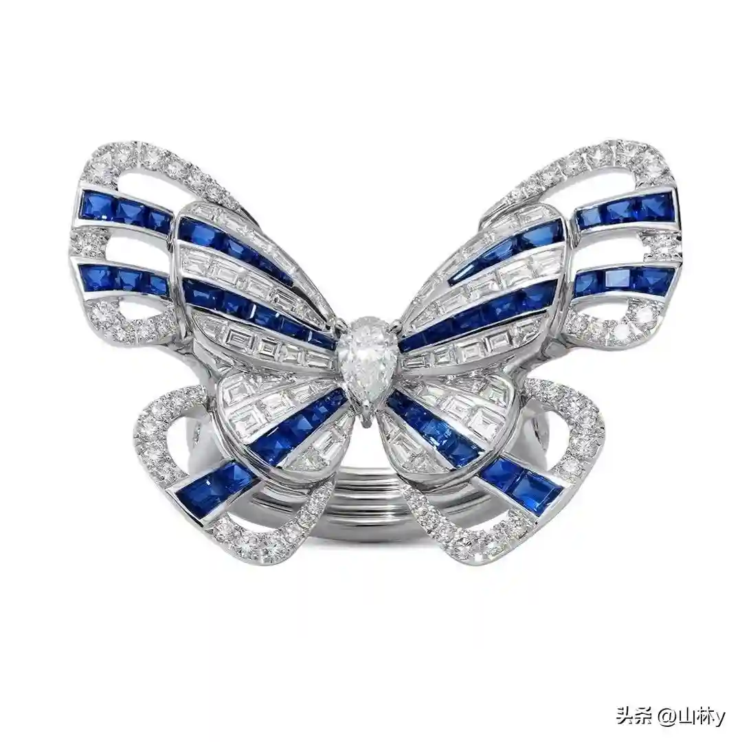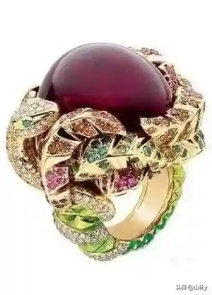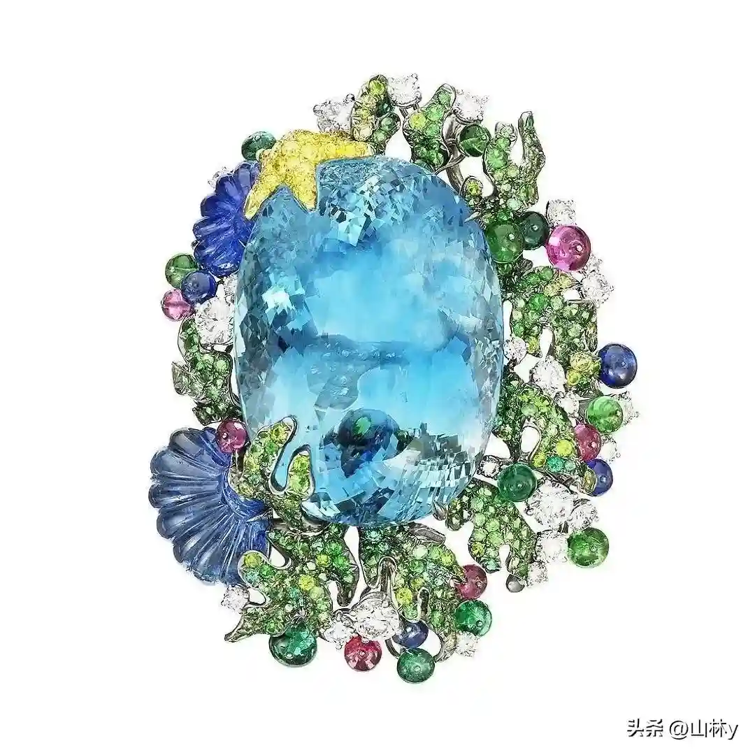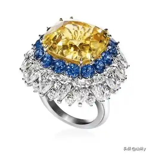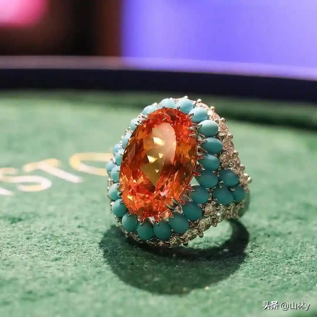 这枚硕大的戒指,戒面是由宛如海洋般的蓝色的蓝宝石镶嵌,旁边装饰有绿宝石、蓝宝石和白钻,整个戒指看起来珠光宝气,雍容华贵。