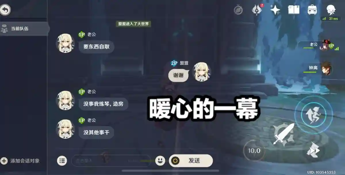 然而事情总是具有两面性的,并不是所有玩家都很冷,也有不少玩家乐意向我这种缺少突破材料的人来他们的大世界拾取材料,当然我们也要礼貌的给出问候【咳咳咳,大佬,我刻晴突破缺少石珀,能不能在你这里拿几个呢?】,结果暖心的一幕出现了,我还没有开始问候,这位名叫【老公】的玩家就给我发了一条消息【要东西自取】,我回应【谢谢】后,他说【没事我练琴,造房,没其他事干】。