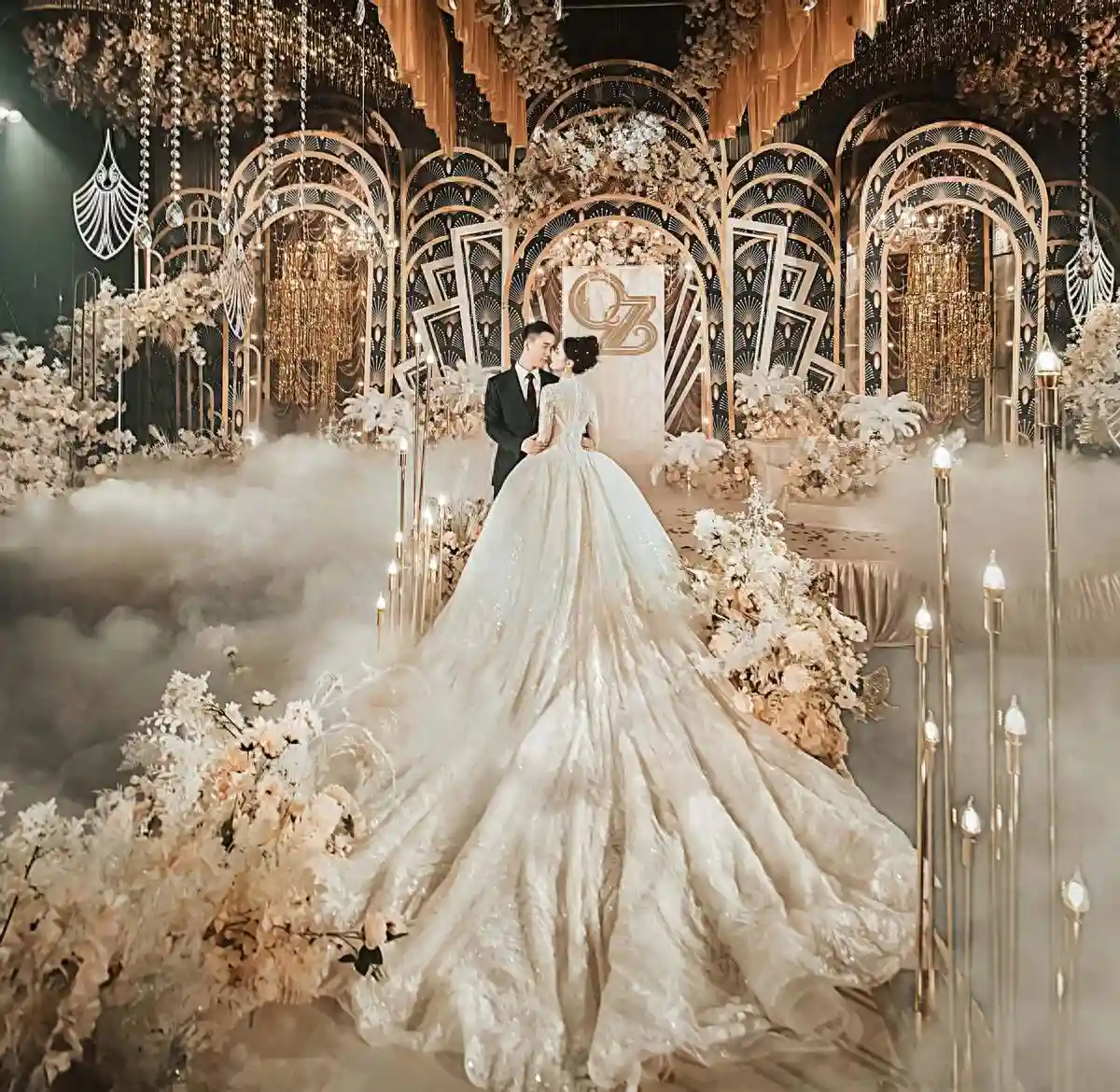 这场婚礼的豪华程度,简直让人瞠目结舌!婚礼场地选在了瑰丽酒店,整个酒店被布置得如同一个童话世界。水晶吊灯闪烁着耀眼的光芒,鲜花簇拥着每一个角落,香槟色丝绸帷幔从天花板垂下,营造出一种梦幻般的氛围。