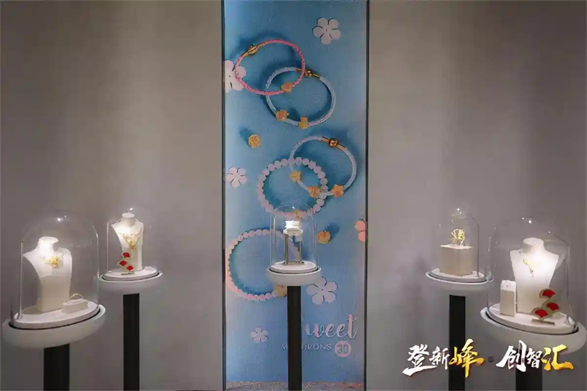 走过悠长的文化园林回廊,展厅陈列区豁然开朗,逐渐揭开产品的神秘面纱。3D硬金、5D硬金、闪耀金、赫囍金、般若金、新古法金、C2M极速智造首饰、《绝色》色彩文创、《字·慧》文字文创、《丝路秘境》非遗文创等整齐地陈列在展柜里,以优雅的姿态呈现给每一位客户。