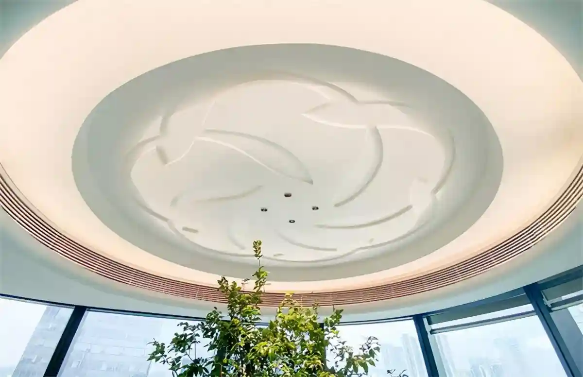 你以为只是脚下的风景?抬头,发现休闲区天花吊顶引用的是峰汇徽标的辅助元素,代表十二条灵动的鱼儿在生生不息地循环游动,象征万物自然生生不息之道,尽显哲学之美。