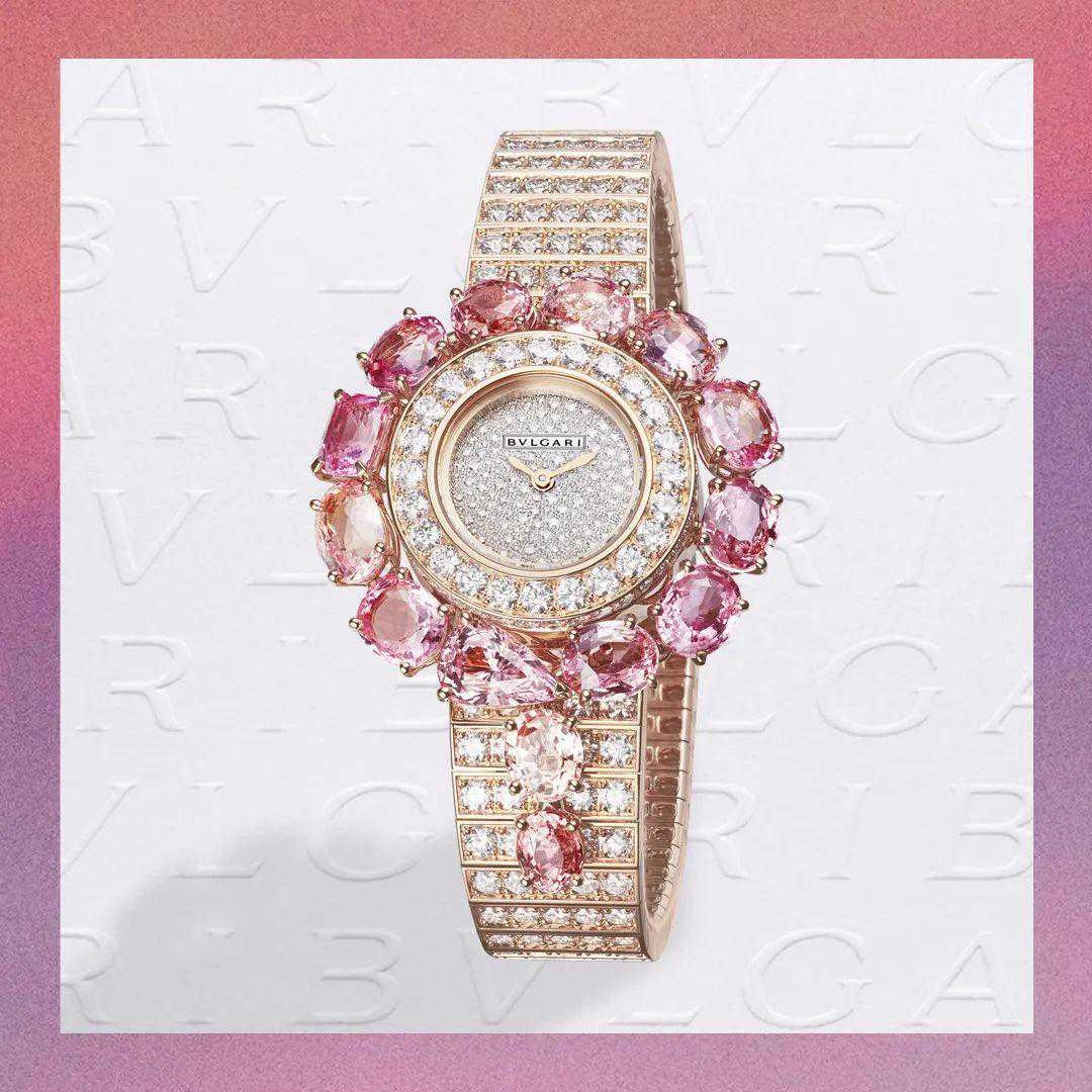 腕表是宝格丽标志性灵蛇元素,材质为从全球各地甄选总重逾95克拉的红碧玺,用金线将镶嵌的圆形切割钻石和凸形蛋面切割红碧玺串联在一起,每一颗碧玺都宛如飘在空中。缎面白色的婚纱配上碧玺,整个就是一个富家千金的味道,爱了爱了。