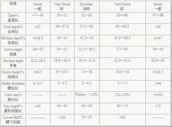 切工级别“53.0-66.0,41.5-45.0”:这个解释起来比较繁琐,也很困难。切工级别分为极好-差,级别好坏即字面意思。事实上影响切工远不止证书里那两个因素,只是说这两个因素为重要因素而已。切工级别是要根据比率级别和修饰度综合评价。下图为某个比率级别表,数据和翻译都不是对应我国的国标,但是形式差不多。