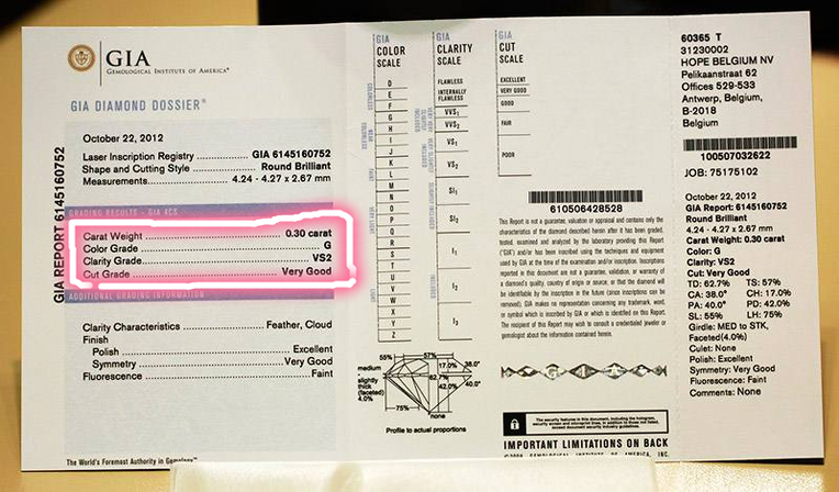下面是一张美国宝石研究院(GIA)的钻石分级证书,荧光圈里就是这颗钻石的4C级别。