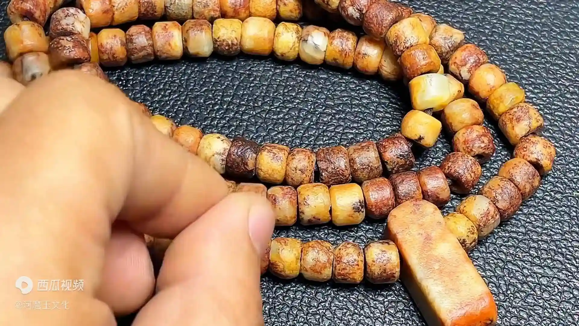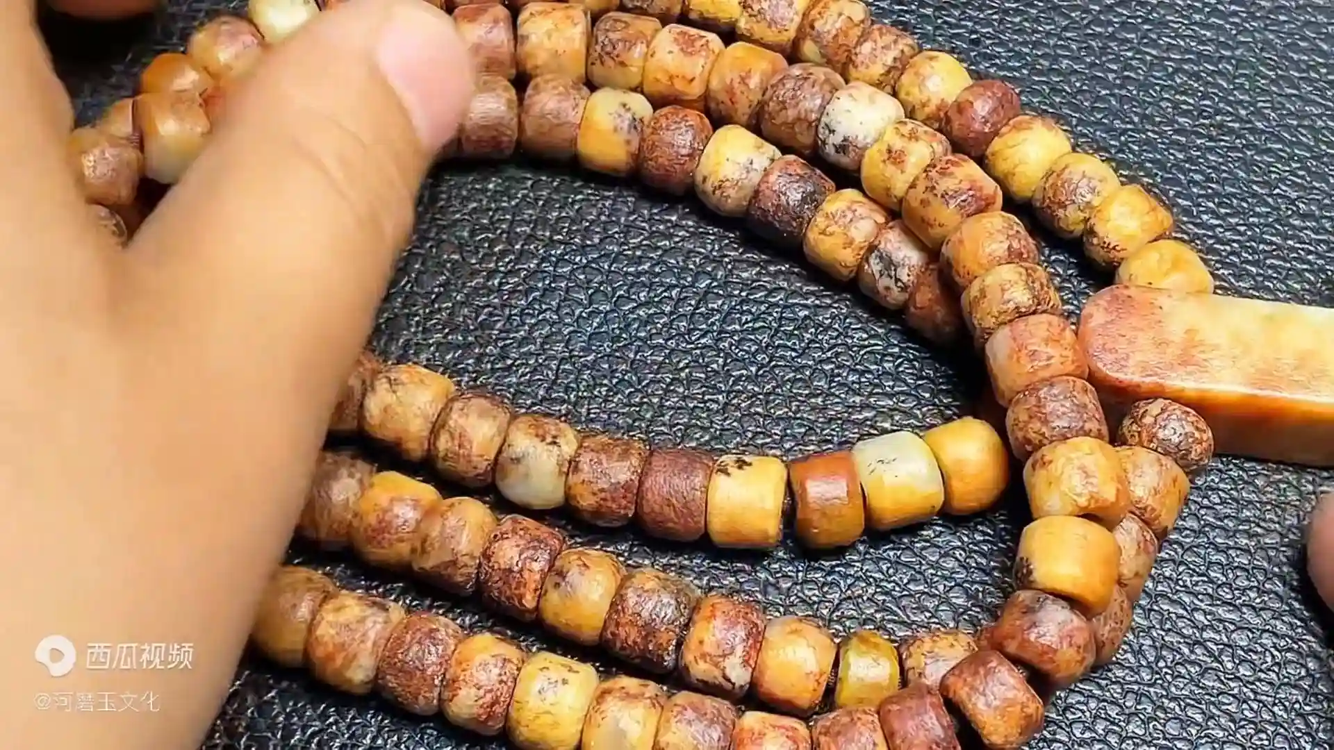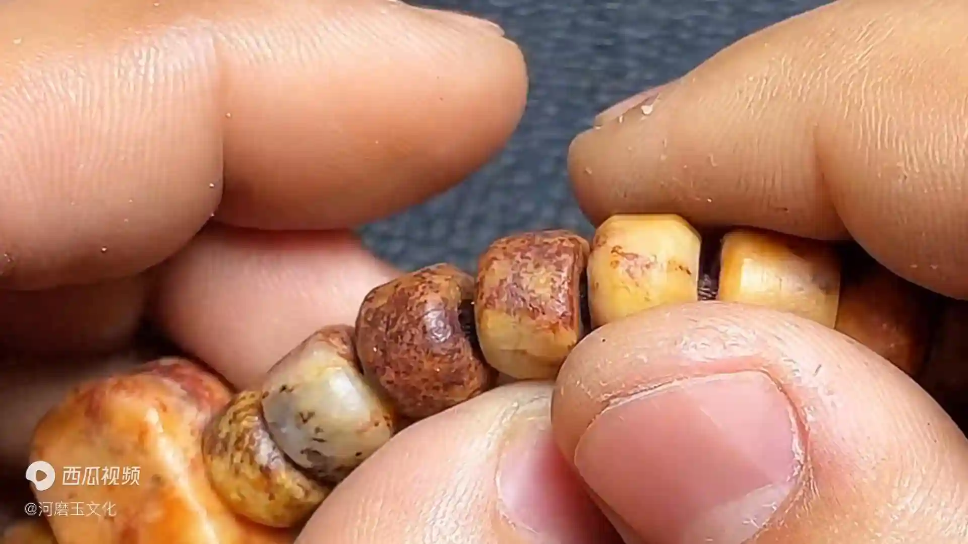 有一个上海的老铁就把它结缘了,这个料是属于什么料?是黄白河磨的糖油皮,这种感觉的,带点皮肉相间的。这个是直切的,手工打完孔了之后单个孔要破孔,再加上倒角,全是手工做的,一颗颗做。抛光是搓的橘皮纹。
