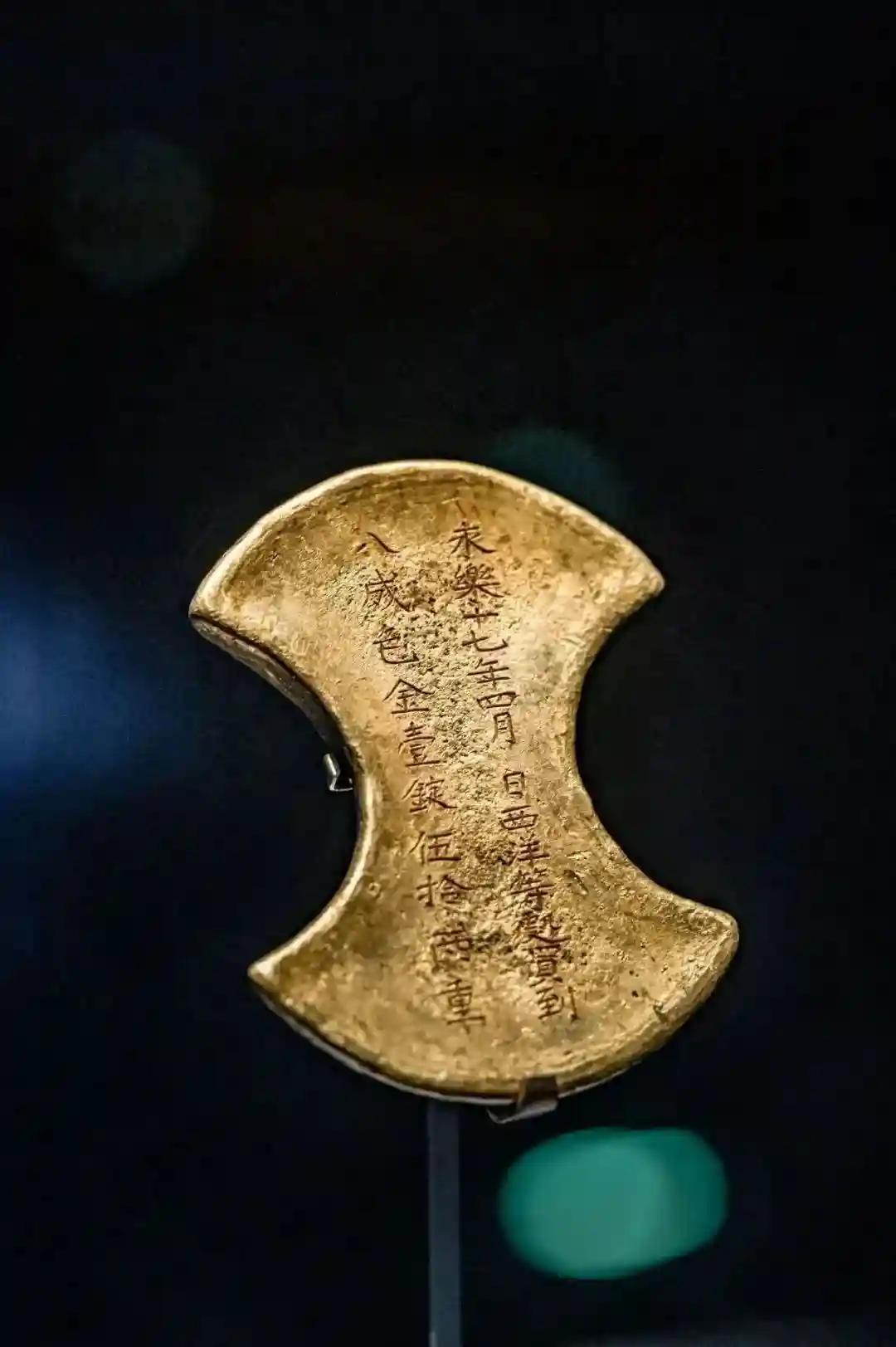 AccordingtoYongLeShiLuofMingShiLu,ZhengHe'sfifthvoyagetotheWesternseaslastedfromthe16thdayofthe5thmonthinthe15thyearofthereignofYongle(1417)tothe17thdayofthe7thmonthinthe17thyearofthereignofYongle(1419).Theinscriptiononthisgoldingotsaysthe'fourthmonthofseventeenthyearofthereignofYongle',soitwascastonashipwhenZhengHewasreturningfromhisfifthvoyagetotheWesternOceans,,whenaprincewasgettingmarried,,thisgoldingot,whichhadbeenbroughtbackbyZhengHe,wasprobablygiven'buy',,whenZhengHeledtheworld'slargestfleettotheWesternseas,,EmperorTaizuofMing,toestablishfrilyrelationswithothercountries,theycarriedpower.