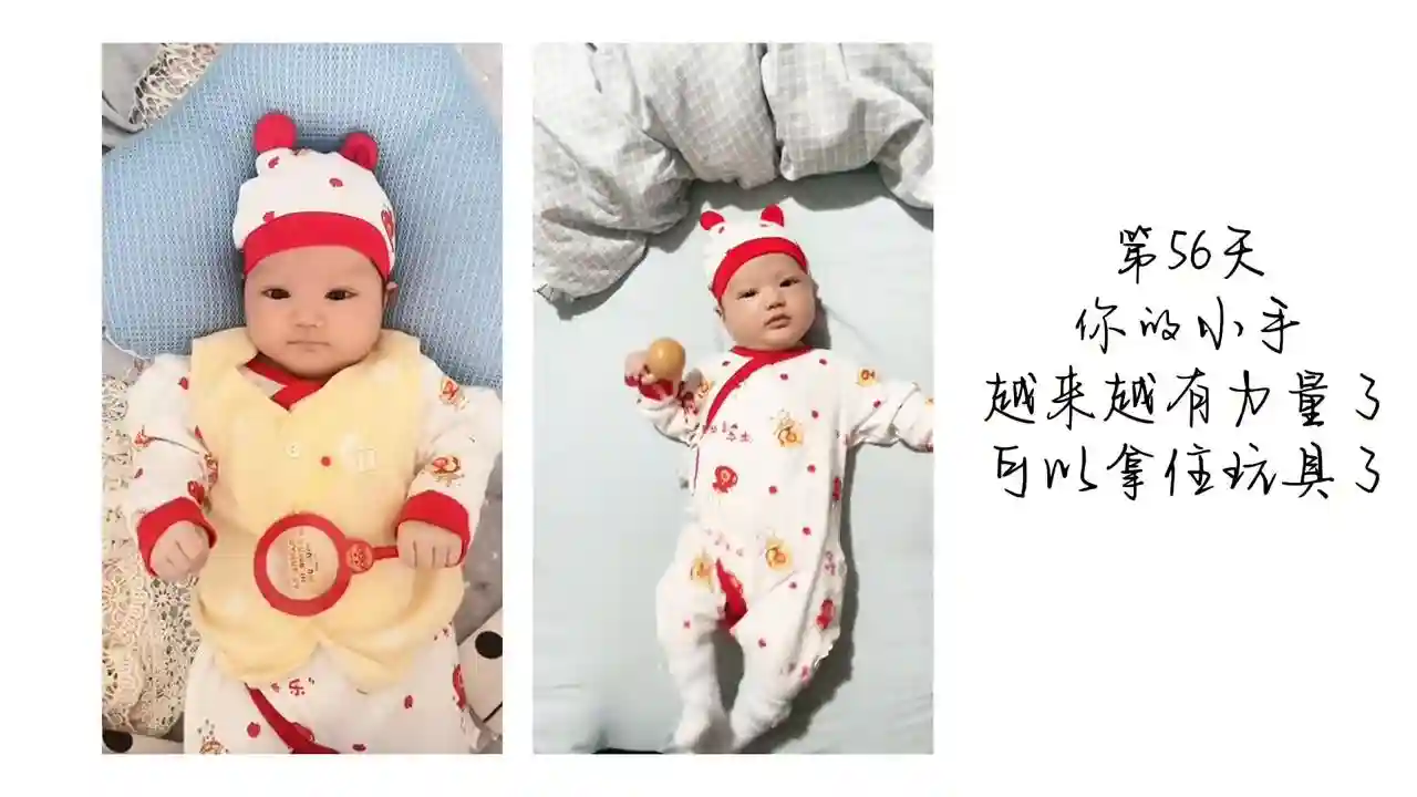 ·第56天,你的小手越来越有力量了,可以拿位玩具了。现在越来越爱笑了,这脸也是日渐圆润。